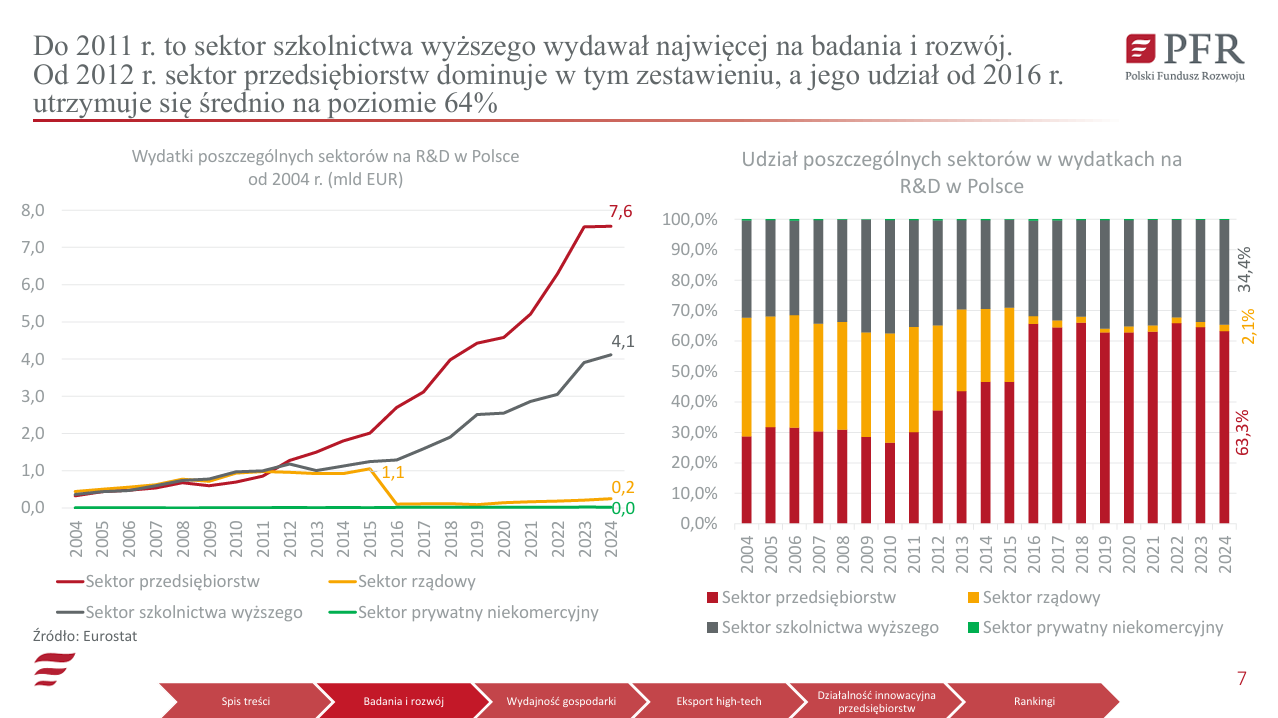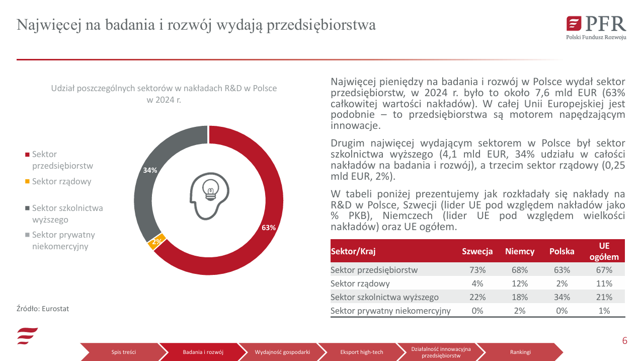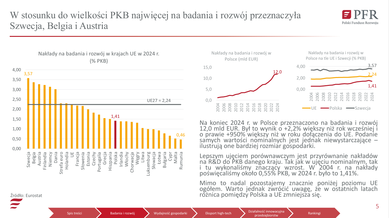 W ujęciu wartościowym Polska jest ósmym największym eksporterem wysokich technologii w Unii Europejskiej. Pod względem udziału wysokich technologii w eksporcie towarowym ogółem jesteśmy na 14. miejscu.
