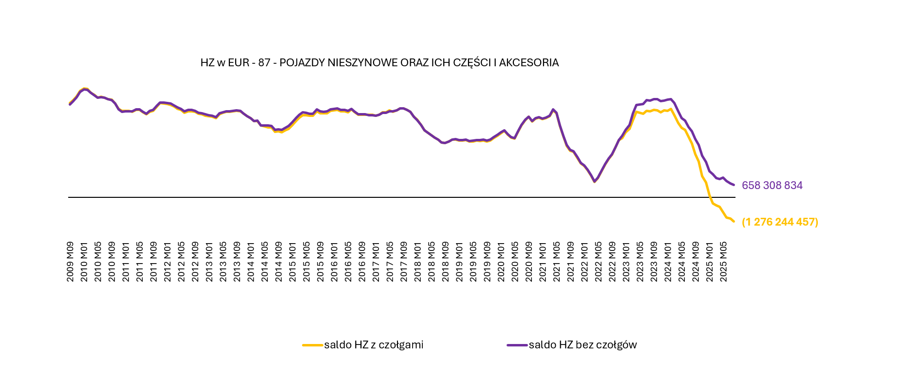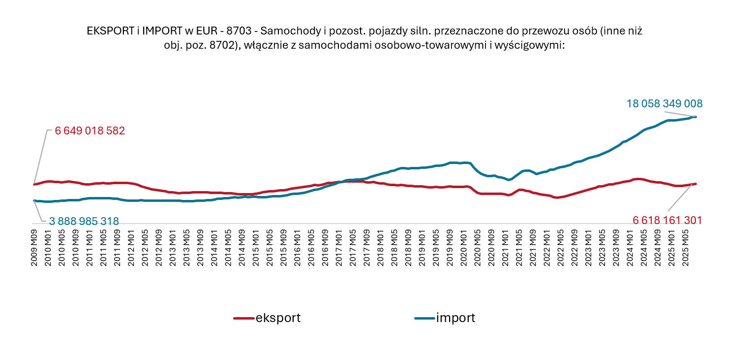 Zasadniczym źródłem dużego deficytu w handlu zagranicznym Polski jest handel samochodami osobowymi, który urósł w ciągu ok. 3 lat z ok. -4,2 mld EUR do ok. -11,4 mld EUR.