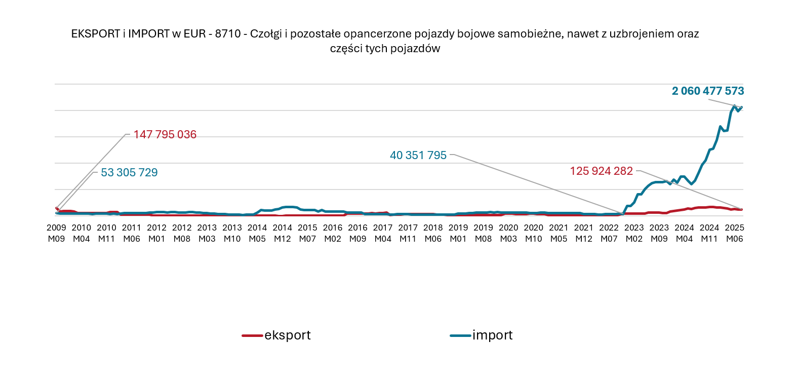 Równowagę w statystyce HZ branży automotive w Polsce naruszyły w sposób spektakularny czołgi, opancerzone wozy bojowe.  W ciągu 2 lat ich import  wzróśł z ok 40 mln EUR do ok. 2060 mln EUR obecnie.