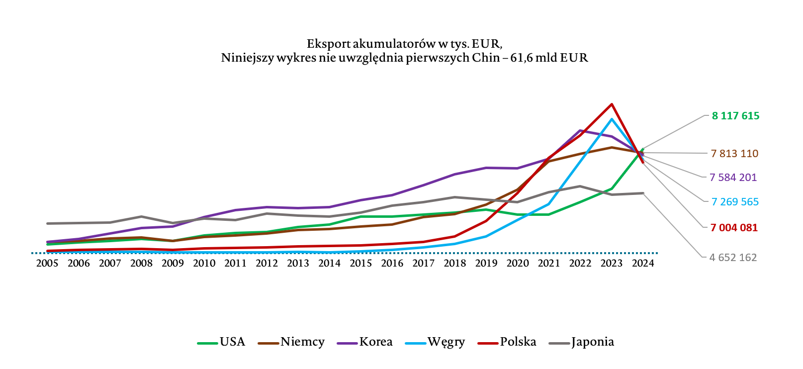 Po 2024 r. Polska spadła na 6 pozycję z 2 pozycji w 2023 r. wśród największych światowych eksporterów akumulatorów (wartość w EUR).