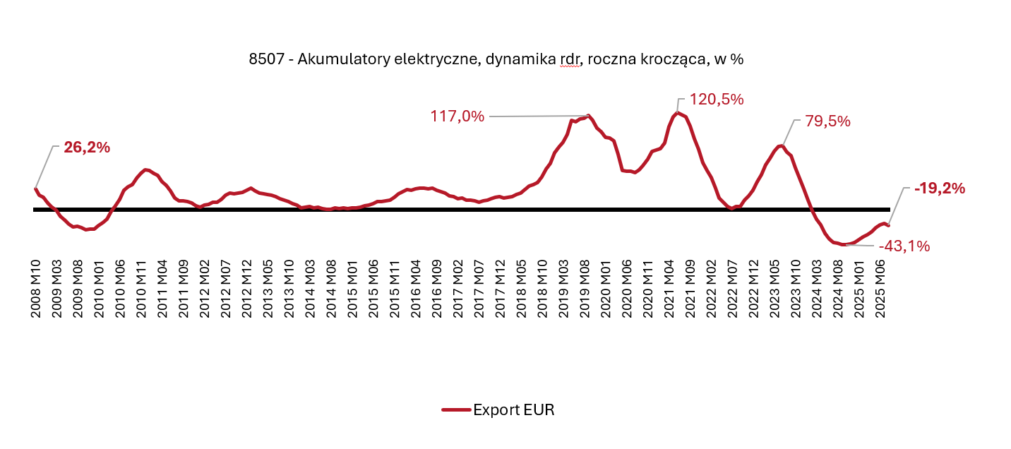 Ujemna dynamika roczna eksportu akumulatorów w EUR z Polski po sierpniu wyniosła -19,2%. Ujemna dynamika uległa spłyceniu z -43,1% rok temu.