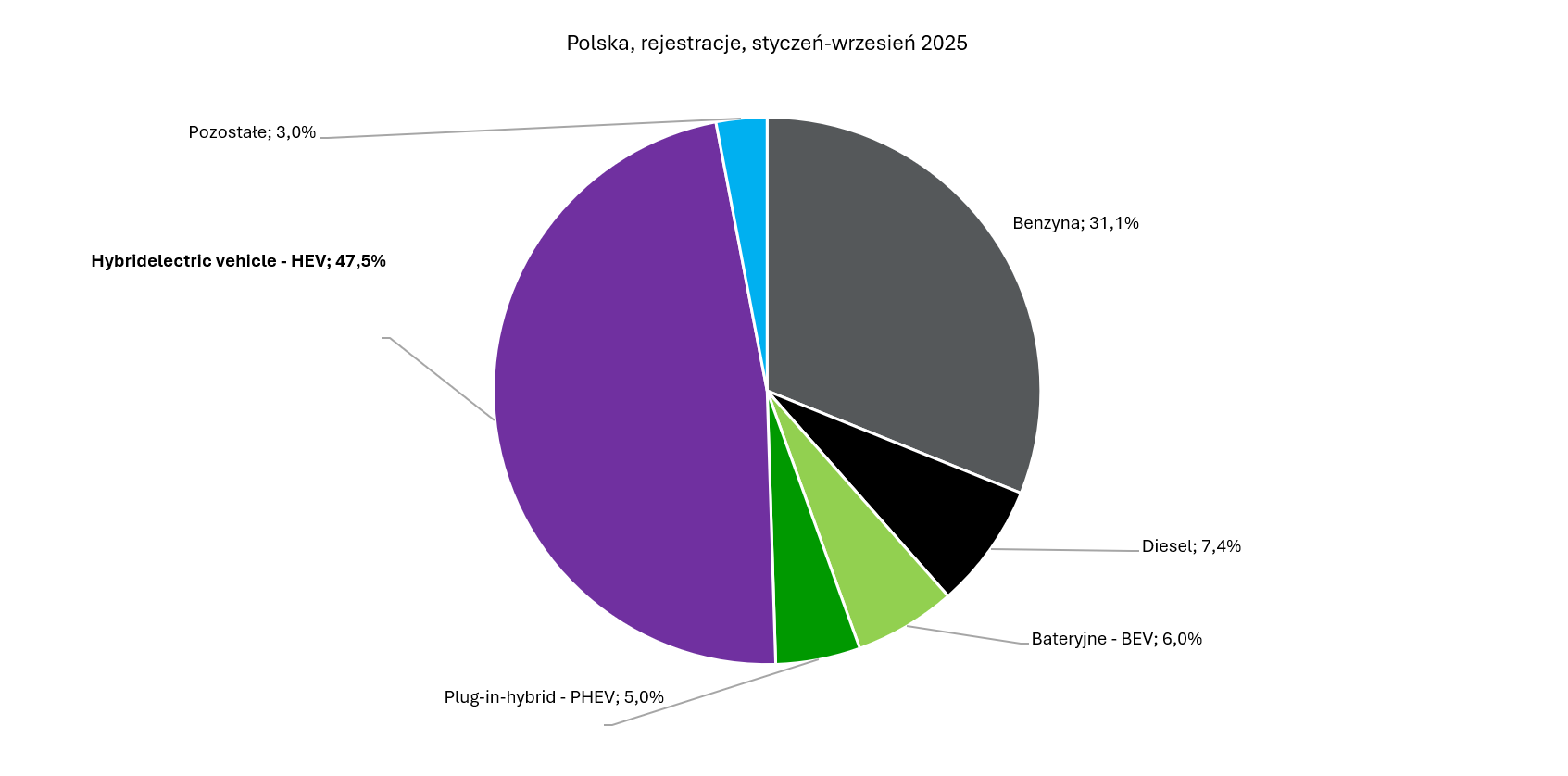 Wśród nowych rejestracji samochodów w Polsce dominują hybrydy bez możliwości ładowania (47,5% rejestracji nowych samochodów osobowych ogółem). Programy wsparcia zakupu „elektryków” pozytywnie wpływają na wzrost udziału tych samochodów wśród nowych rejestracji.