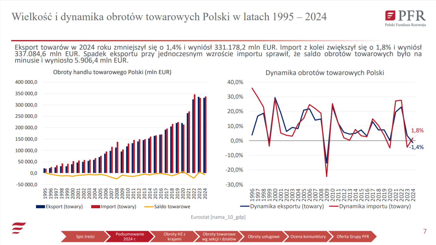 • Dzięki nadwyżce w obrotach usługowych saldo obrotów handlu zagranicznego Polski ogółem po trzech kwartałach 2025 r. było dodatnie i wyniosło około +24,4 mld EUR – przy zastrzeżeniu, że dane o obrotach towarowych pochodzą z GUS, a dane o obrotach usługowych z NBP.
