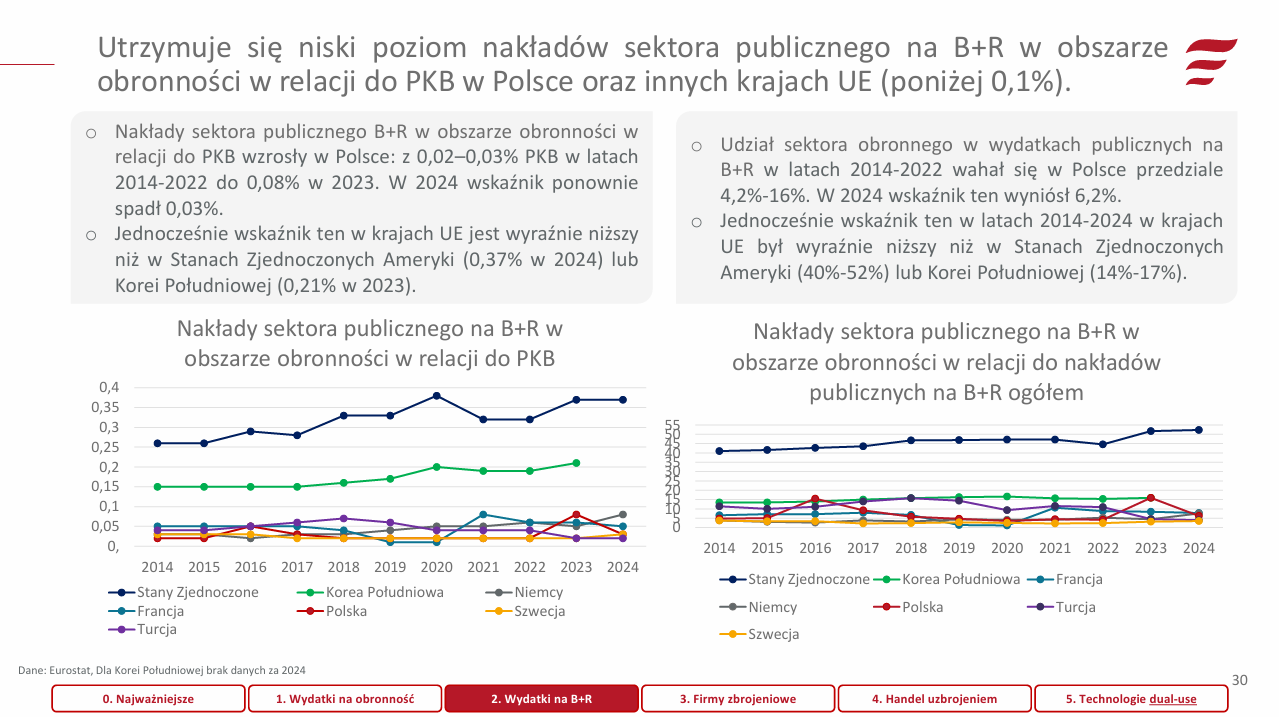 Nakłady sektora publicznego na B+R w obszarze obronności w relacji do PKB są w Polsce na niskim poziomie podobnie jak w innych krajach UE (poniżej 0,1%). W wartościach nominalnych w EUR, nakłady publiczne na B+R w dziedzinie obronności w Polsce w 2024 stanowiły 7% nakładów w Korei Południowej w 2023 (brak danych za 2024).