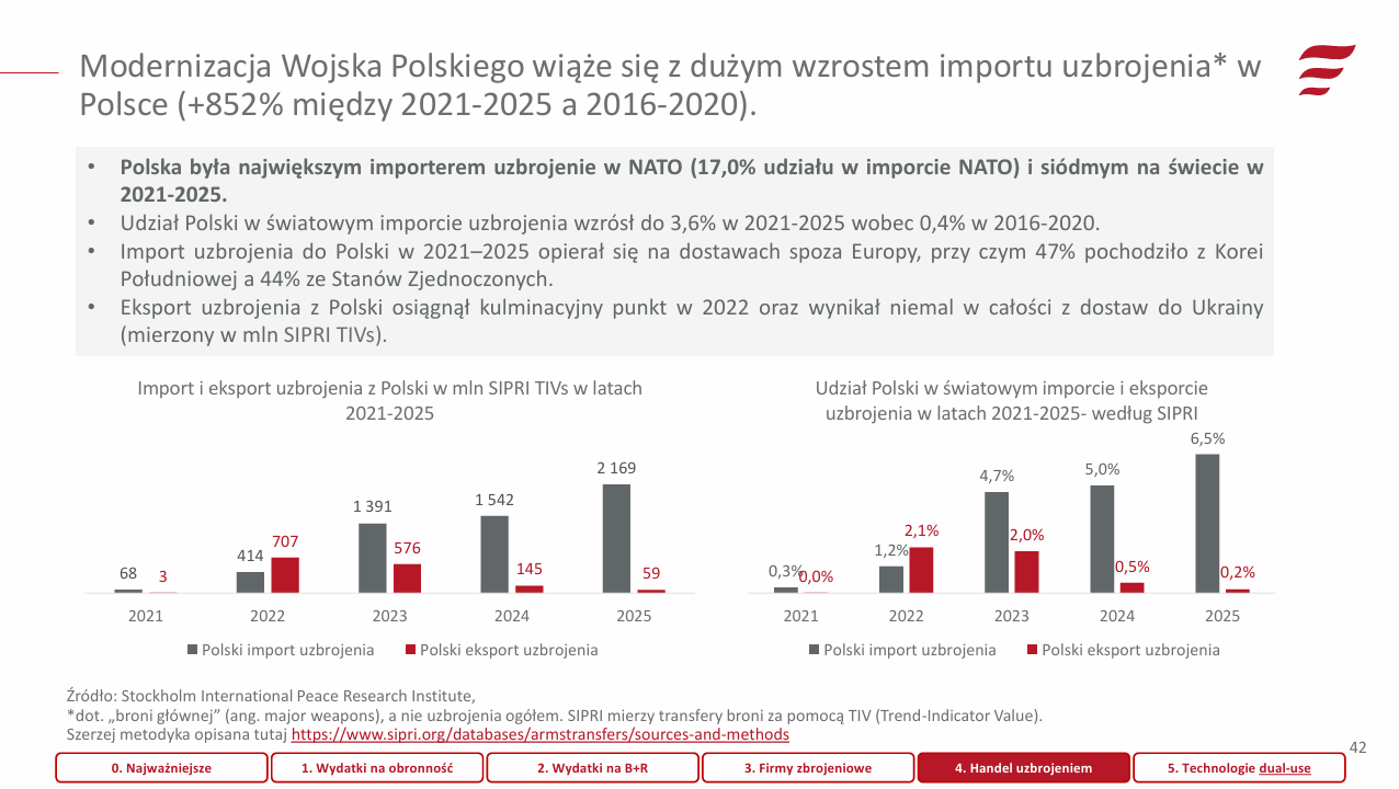 Modernizacja Wojska Polskiego wiąże się z dużym wzrostem importu uzbrojenia w Polsce (+852% między 2021-2025 a 2016-2020). Udział Polski w światowym imporcie uzbrojenia wzrósł do 3,6% w 2021-2025 wobec 0,4% w 2016-2020.