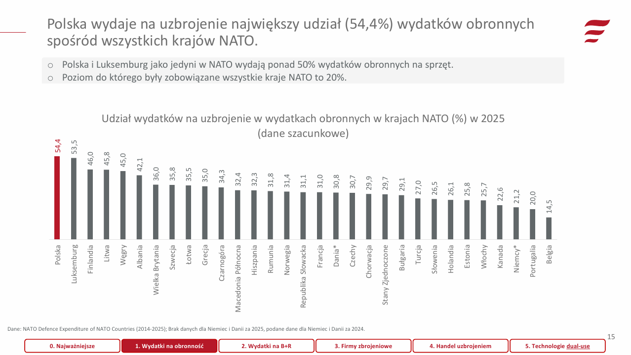 Polska wydaje na uzbrojenie największy udział (54,4% w 2025) wydatków obronnych spośród wszystkich krajów NATO. Wzrost udziału wydatków na uzbrojenie najbardziej pomniejszył udział wydatków na personel (z 42,7% w 2022 do 26,7% w 2025).