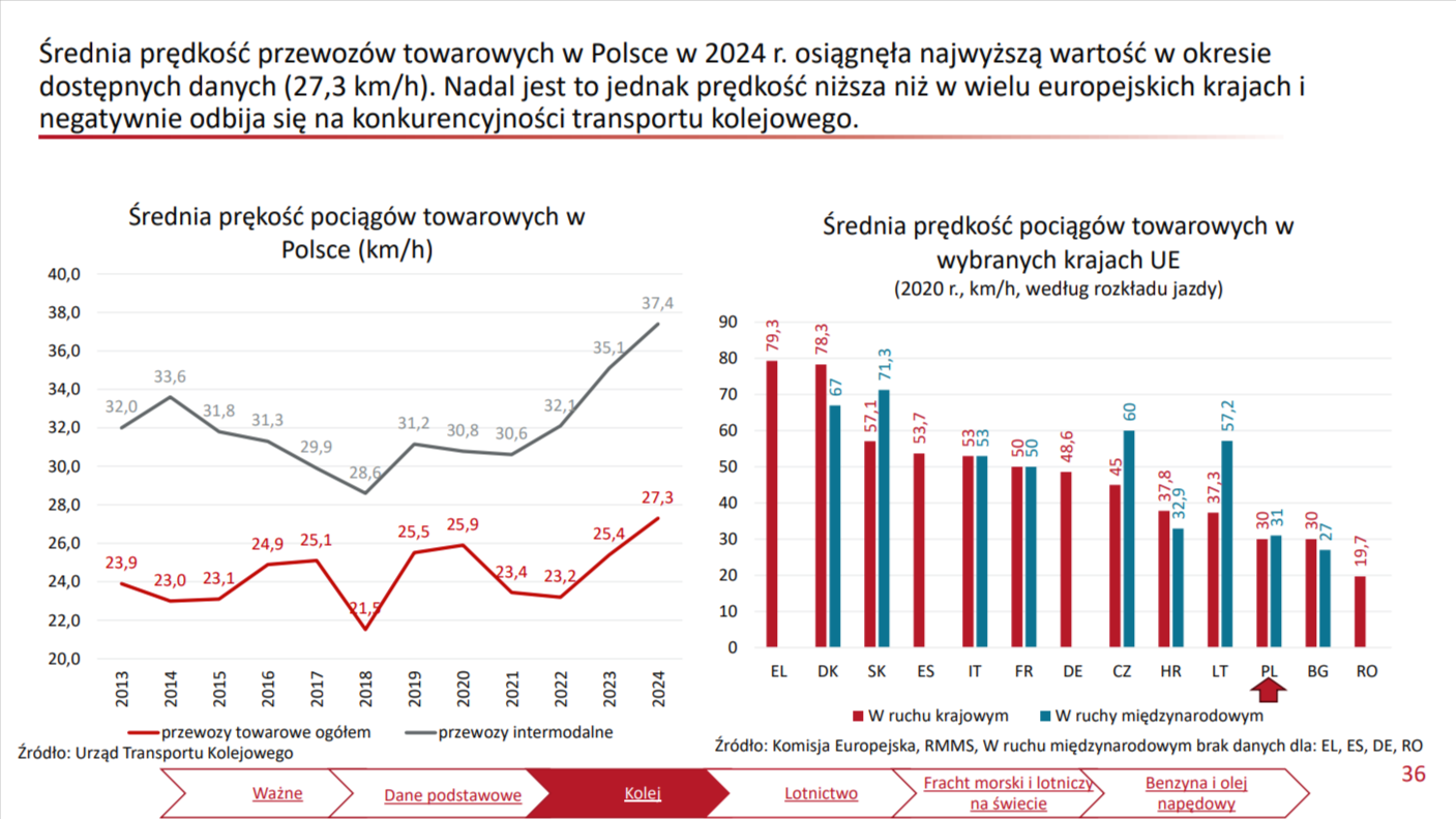 według danych Urzędu Transportu Kolejowego średnia prędkość przewozów towarowych ogółem w Polsce w 2024 wyniosła 27,3 km/h a w przewozach intermodalnych 37,4 km