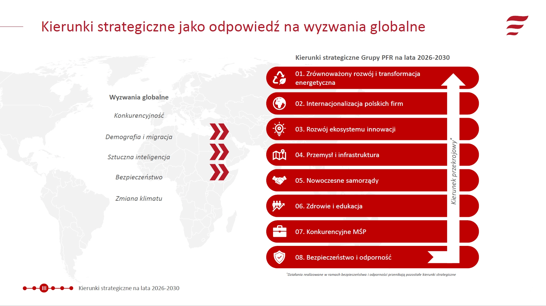 Nowa Strategia Grupy PFR odpowiada na najważniejsze wyzwania globalne – takie jak transformacja energetyczna, rozwój sztucznej inteligencji, bezpieczeństwo, zmiana klimatu czy demografia. Ukierunkowana na długofalowe wspieranie policentrycznego, zrównoważonego terytorialnie rozwoju Polski, koncentruje się na ośmiu priorytetowych obszarach: