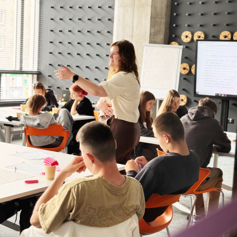 Niedziela była poświęcona rozwijaniu kompetencji miękkich. Marta Kupisz – menedżerka zespołu PFR dla Miast w PFR S.A. przeprowadziła warsztaty z autoprezentacji i komunikacji podczas rozmowy rekrutacyjnej, które pomogły uczestnikom nabrać pewności siebie i przygotować się na przyszłe rozmowy kwalifikacyjne. Zajęcia pozwoliły młodzieży zidentyfikować swoje mocne strony i zdefiniować zawodowe marzenia, a następnie je połączyć. Uczestnicy przeszli również przez symulację pełnego procesu rekrutacyjnego – od wyboru rodzaju pracy i szukania ofert, przez przygotowanie dokumentów aplikacyjnych, aż po symulację rozmów kwalifikacyjnych i analizę najczęściej zadawanych pytań. Warsztaty pokazały, że nawet bez dużego doświadczenia można zrobić profesjonalne pierwsze wrażenie, pod warunkiem, że zna się swoje atuty i potrafi mówić o nich otwarcie i z przekonaniem. Ostatnie zajęcia tej edycji poprowadziła wyjątkowa postać – Aurelia Sobczak – uznana aktorka teatralna i filmowa, scenarzystka, reżyserka i trenerka, która skupiła się na wystąpieniach publicznych. Podjęła temat tego, jak mówić, by być słuchanym oraz, jak mówić o sobie, aby przekonać rozmówcę do zmiany punktu widzenia. Zajęcia łączyły techniki aktorskie z elementami pracy z ciałem, głosem i emocją. Pomogły im poczuć się pewniej w sytuacjach, w których muszą zabrać głos, niezależnie od tego, czy chodzi o rozmowę rekrutacyjną, wystąpienie na forum, czy codzienną wymianę zdań. Uczyli się, jak ufać swojemu głosowi, jak mówić z przekonaniem, jak być obecnym, nie tylko fizycznie, ale i emocjonalnie.